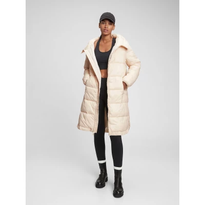 This jacket is made with 100% recycled nylon. Less waste in the world. More great clothes for you. Contains water-resistant Primaloft insulation which looks, feels, and has all the warmth of down. All achieved using recycled materials! Long sleeves. Hooded neckline. Snap-button at side vents. Front slant pockets. This product was made in a factory that runs the Gap Inc. P. A. C. E. (Personal Advancement & Career Enhancement) program. P. A. C. E. is our educational program that helps the women who make our clothes build the skills, knowledge, confidence & resilience needed to advance in work & life. Learn more at gap. com/pace Straight silhouette with a relaxed fit. Hits at the knee. Nissa is 59. 5/177cm with a 31/79cm chest, 24/61cm waist, 35/89cm hip wearing a regular Gap size S. Brianna is 58/173cm with a 38/97cm chest, 34/86 waist, and 45/114cm hips wearing a regular Gap size XL. Recycled Nylon 100%