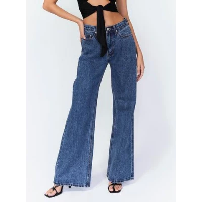 Denim jeans Relaxed leg Princess Polly exclusive Length of size AU 8 / US 4 waist to hem: 109cm / 42.9 Gayeanne is wearing a size AU 6 / US 2 100% cotton Mid rise fit Wide flared leg Zip & button fastening Belt loops at waist Patch on back Classic five pocket design Contrast stitching Non stretch