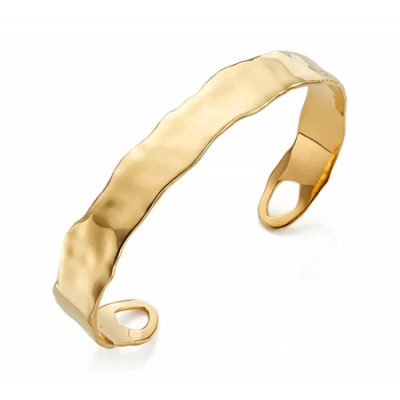 A true bold gold piece. The cuff is lightly hammered for a unique look and can be worn with the opening up or down. Style it your way! Small: circumference 15.4cm, opening width 2.3cm, inner diameter 5.4cm Medium: circumference 16.5cm, opening width 2.5cm, inner diameter 5.8cm Large: circumference 17.8cm, opening width 2.7cm, inner diameter 6.2cm Bar width undulates 8.5mm-1.5cm Product code - GP-CF-SPCM-NON