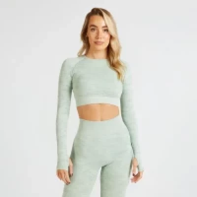 Do your reps in style! Featuring a camo print mid-riff crop top with a flattering fit. A seamless, buttery-soft fabric that gives a figure-enhancing finish with a banded high-low waistline. A round neckline supporting long sleeves with thumbholes for smooth movements.