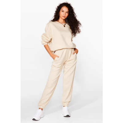 Womens Oversized Slouchy Sweatshirt and Joggers Set - Beige - S - Self care, baby. The sweatshirt features a crew neckline, relaxed silhouette and fitted cuffs. The matching joggers feature a high-waisted, relaxed silhouette and elasticized waist and cuffs.